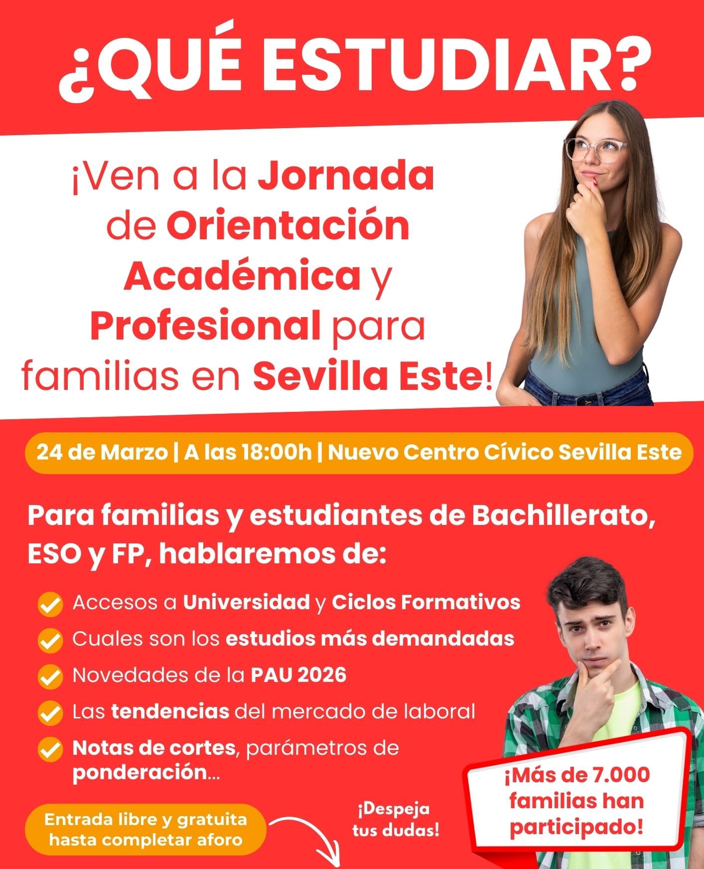 ¿Estás estudiando ESO, Bachillerato o Formación Profesional y tienes que decidir tu futuro profesional? ¿Te sientes abrumado por la cantidad de opciones y las nuevas normativas? ¡No te preocupes! La Fundación Cámara de Sevilla y el Distrito Este te invita a una jornada gratuita, el 24 de marzo a las 18:30h en Sevilla Este, diseñada para ayudarte a ti y a tu familia a tomar la mejor decisión para tu futuro académico y profesional. Jornada de Orientación en Sevilla Este Un equipo de expertos te guiará a través de los…